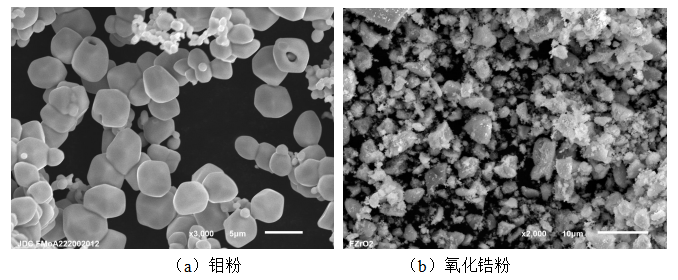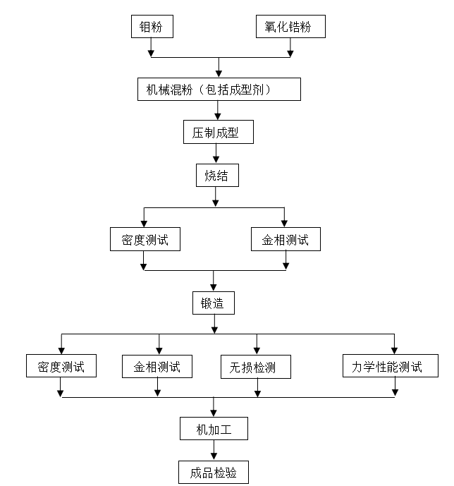 試驗原材料為純度>99.95%鉬粉和氧化鋯粉(符合相關(guān)標準),形貌圖片如圖1(a)和(b)?;旌媳壤秊?9.5~95%鉬粉和0.5~5%氧化鋯粉(質(zhì)量百分比)。試驗工藝流程見(jiàn)圖1。將不同比例的兩種粉末進(jìn)行機械混合(包括成型劑等的添加),然后再在相同冷等靜壓壓力下壓制成型,后進(jìn)行燒結,樣品燒結后致密度為95%左右,化學(xué)成分如表1;待樣品進(jìn)行檢測結束后,對其進(jìn)行壓力加工以期獲得優(yōu)異的顯微組織和較高的致密度,本實(shí)驗采用的壓力加工方式為自由鍛造。樣品在鍛造前后均進(jìn)行金相和致密度檢測,對鍛造后樣品進(jìn)行力學(xué)性能測試,致密度檢測利用阿基米德原理,采用非帶阿基米德裝置的電子天平;金相檢測采用MA-100型尼康光學(xué)顯微鏡(其中金相樣品制備為:取樣-機械磨制-拋光-侵蝕等環(huán)節);力學(xué)性能測試采用WDW100型微機控制萬(wàn)能試驗機。