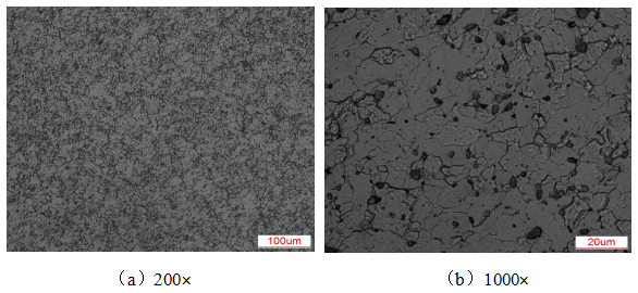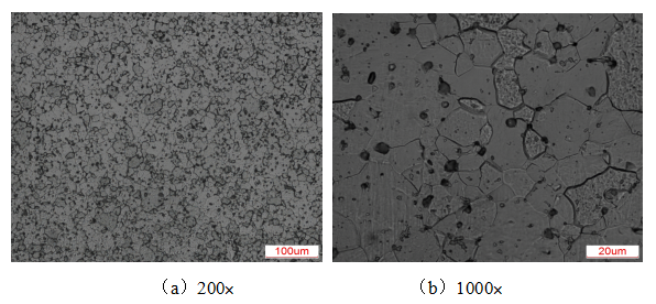 本試驗所用原材料均為高純(純度均大于99.95%)粉末材料,故而在燒結后材料的純度肯定在99.95%以上,因為材料經(jīng)過(guò)高溫燒結,高溫燒結不僅僅是一個(gè)增加材料強度和致密性的過(guò)程,同時(shí)還是一個(gè)材料凈化過(guò)程(低熔點(diǎn)雜質(zhì)在高溫環(huán)境中揮發(fā))。本文僅顯示相對較好的一組添加比例氧化鋯的相關(guān)數據。圖3是一組燒結后氧化鋯鉬電極顯微組織圖片,其中圖3(a)和(b)分別是200倍和1000倍燒結后氧化鋯鉬電極顯微組織圖片。由圖3(a)可知,氧化鋯鉬電極燒結后顯微組織細小均勻,平均晶粒直徑為15μm,氧化鋯粒子均勻分布于晶界上;圖3(b)則清晰顯示氧化鋯粒子以小于5μm的球狀形態(tài)均勻分布于鉬晶界上。